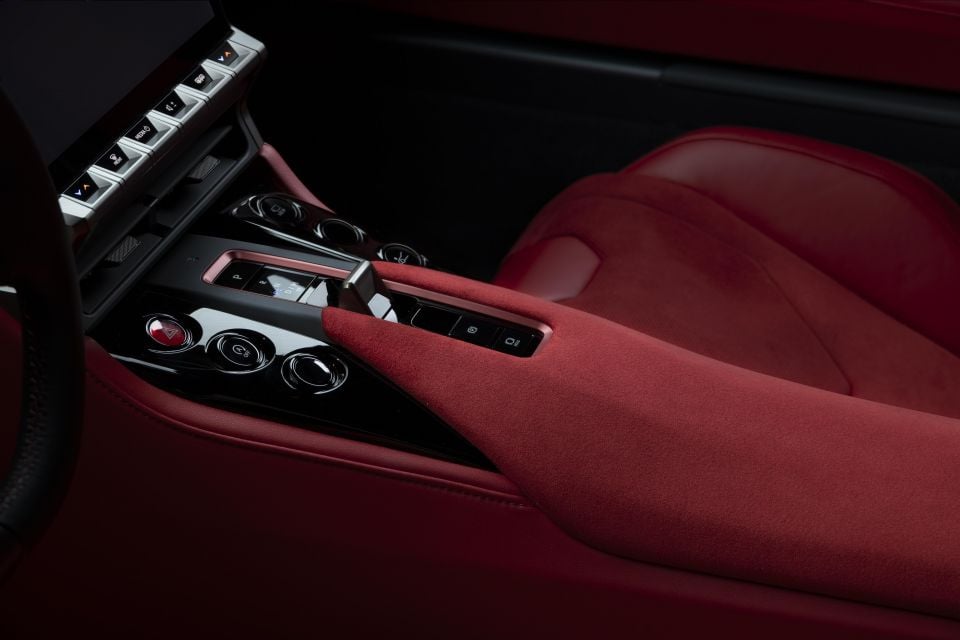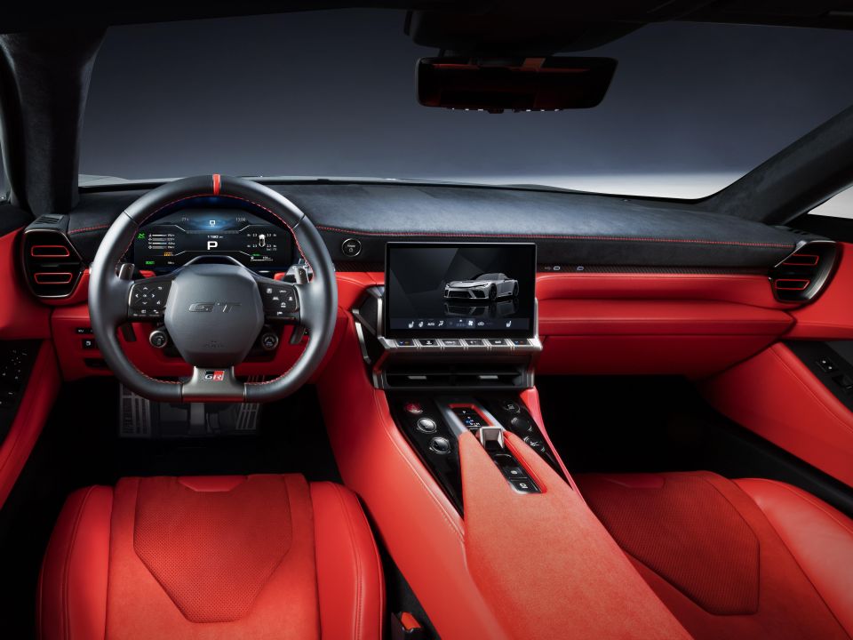 The cabin reflects meticulous attention to achieving an ideal driving position, and is finished in red leather. It features a flat-bottom GR steering wheel with red stitching, behind which sits a pair of paddle shifters and a unique digital instrument cluster.