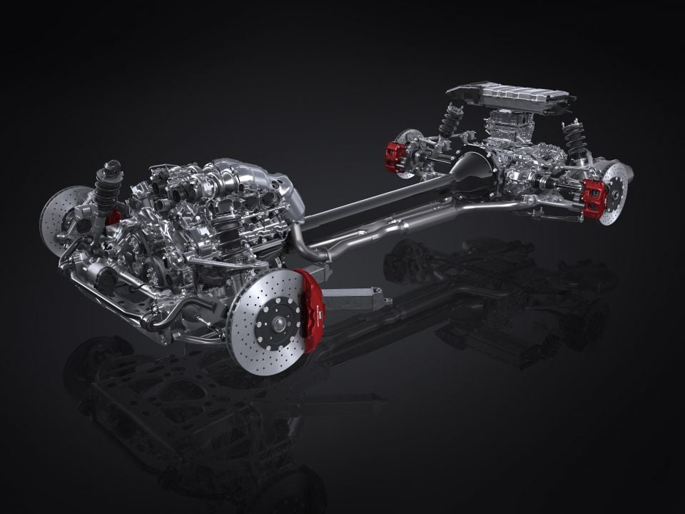 Spreading mass across the car, the rear transaxle incorporates the wet-clutch eight-speed transmission to drive the rear mechanical limited-slip differential. There has been no announcement of a conventional manual gearbox.