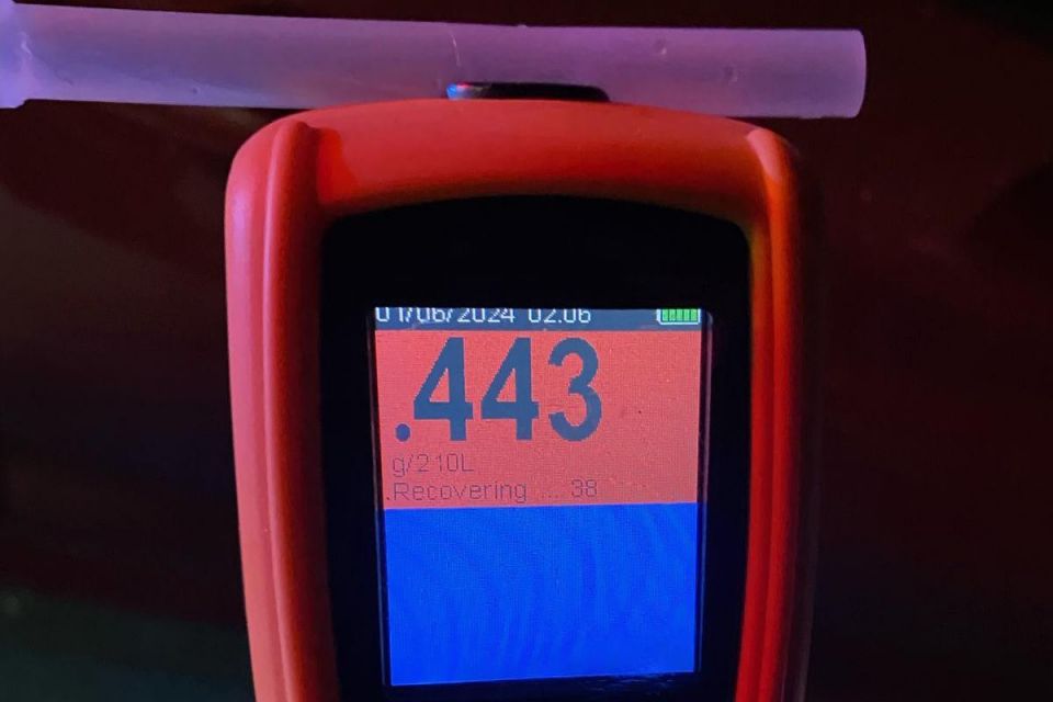 Upon undertaking a roadside breath test, the man returned a BAC of 0.443 – more than eight times higher than the legal limit of 0.05 for fully licensed drivers.