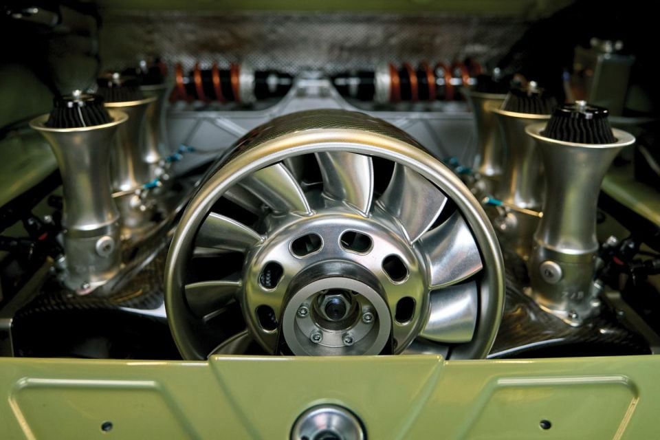 The Z/B 4.4’s air-cooled flat-six displaces 4388cc and is built around an aluminium block machined from solid billet, with billet twin-spark cylinder-heads and coil-per-plug ignition. Bore and stroke are 106.045mm and 82.8mm respectively, and compression is 11.5:1.