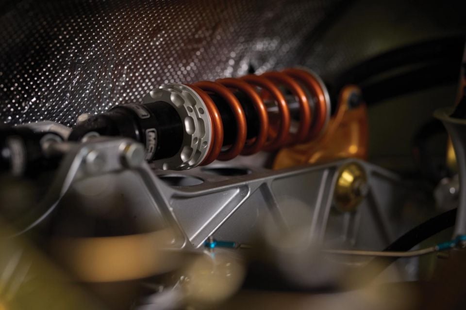 Front suspension comprises a MacPherson strut layout inspired by the 997-generation 911, with aluminium dampers that offer ride-height adjustment and optional four-way damping. At the rear, an independent multi-link arrangement with double wishbones places height-adjustable coil-over dampers inboard, actuated by titanium pushrods mounted to a CNC-machined aluminium bulkhead.