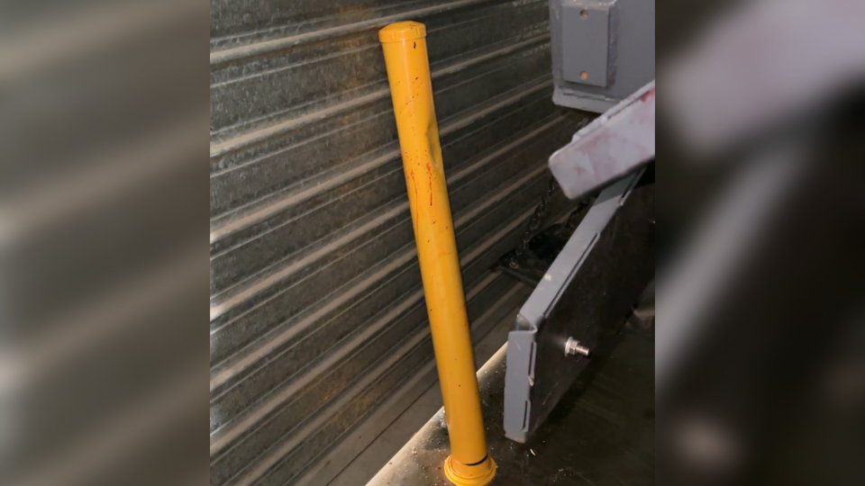 Footage from the scene shows a trail of blood, along with an angle grinder with a broken disc discarded. It’s unclear whether the thief was injured by the armoured personnel carrier running into them, or the blade of the grinder breaking off while attempting to cut the bollard.