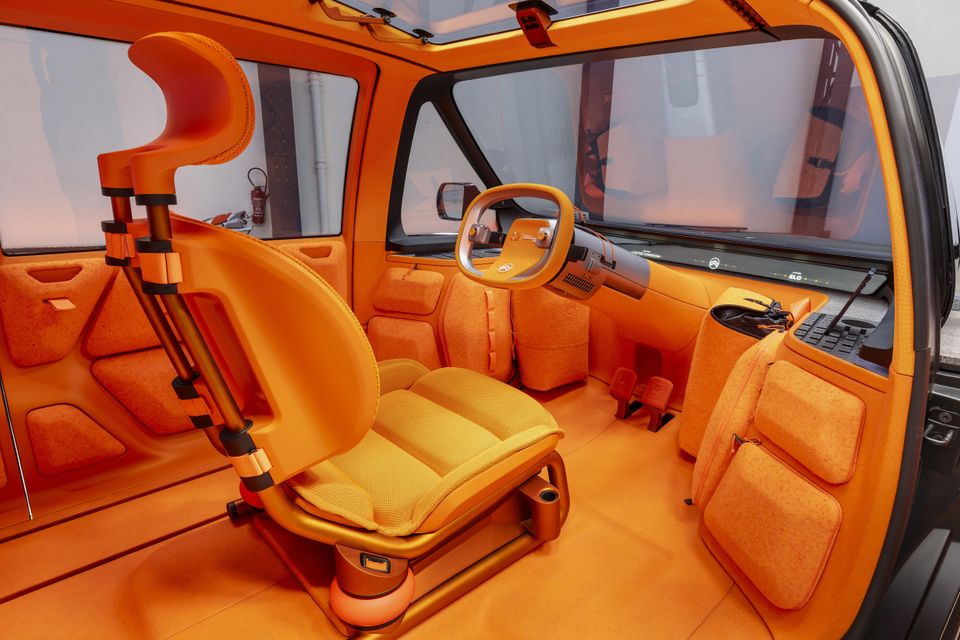 A desk attachment allows the car to function as a mobile office, and the driver’s seat can be rotated around to face the rear passengers.