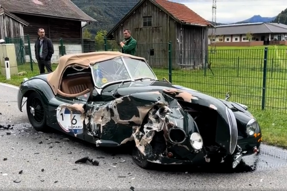 The occupants of a classic Jaguar XK120 are lucky to be alive after allegedly being hit head-on by a driver looking at their mobile phone.