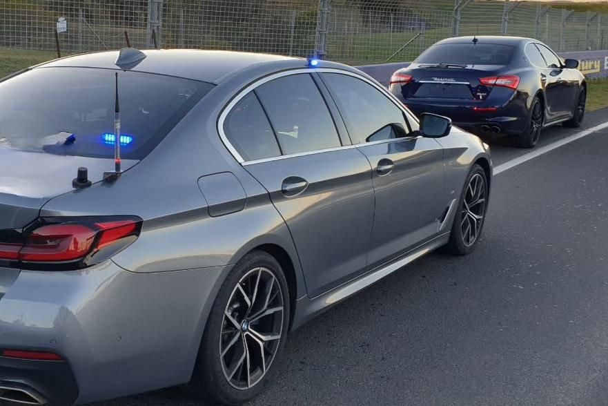 New South Wales police officers said the Maserati had also overtaken two other cars on the opposite side of the road – as Mount Panorama is a two-way tourist drive – prior to blasting past the stationary Highway Patrol BMW 5 Series.