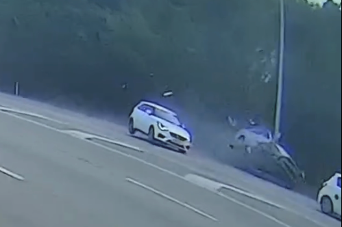 A silver Nissan Pulsar arrives in frame at great speed while taking an exit on the motorway, narrowly missing a Hyundai Tucson before ploughing into the back of an MG 3.