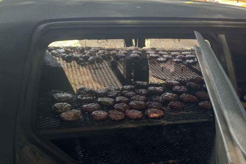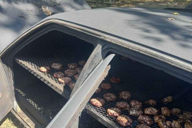 According to the signs on the windows, this old Caddy has been used to cook ham, sausages, brisket, turkey and ribs. The owner has even helpfully demonstrated how many burger patties will fit on the top rack.