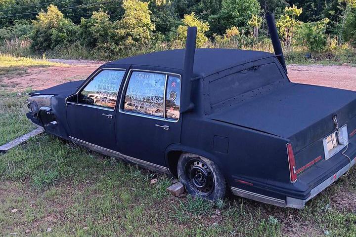 With a mangled grille and bonnet, missing wheel covers, and what looks like a spray can paint job, this Sedan de Ville is a far cry from how it looked in the showroom.