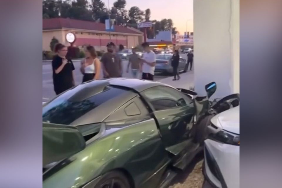 Footage shared online shows a McLaren Senna losing control after doing donuts on a Los Angeles street, and subsequently crashing into a column at a Lexus dealership.