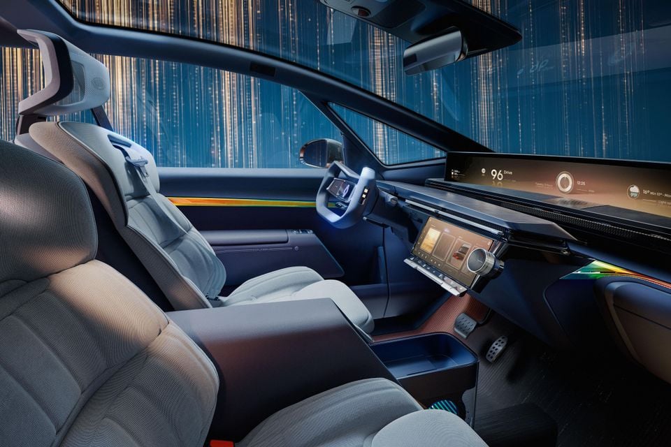 A full-width display is positioned where the thin dashboard meets the base of the windscreen. The front passenger’s seat can slide all the way back to the rear seats, making it easier to interact with any children sitting back there.