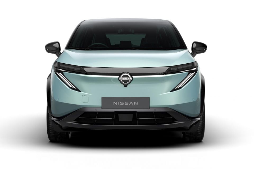 The revised Ariya features a new front fascia that eliminates the current model’s large gloss black faux grille. In its place is a smaller gloss black strip linking the blacked-out main headlight clusters.