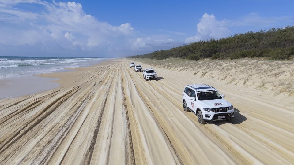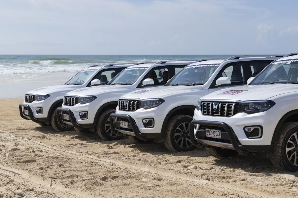 Working in conjunction with Mahindra Australia, their vehicles have been specially modified to suit K’gari’s demanding off-road tracks and sandy beaches, so each Scorpio is fitted with a 2.0-inch suspension lift kit, reinforced underbody protection for the sump, fuel tank and AdBlue tank, and a front nudge bar.