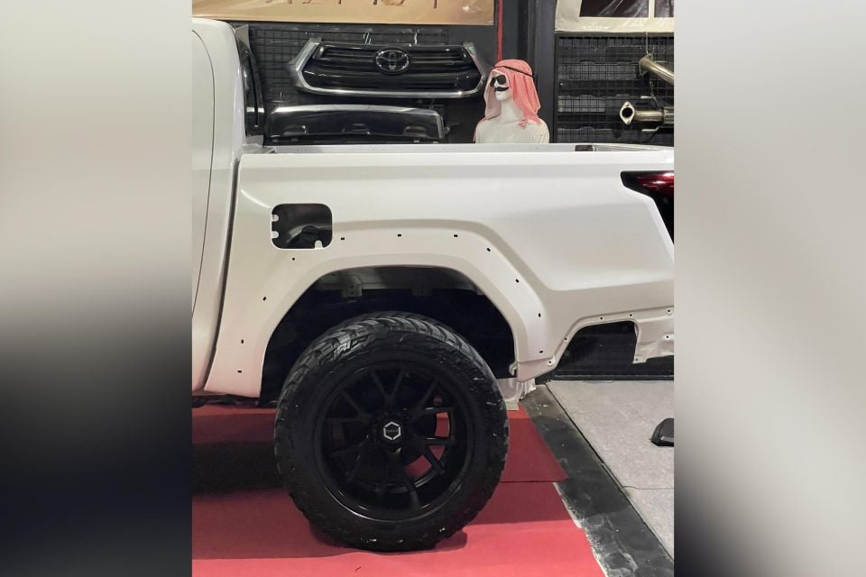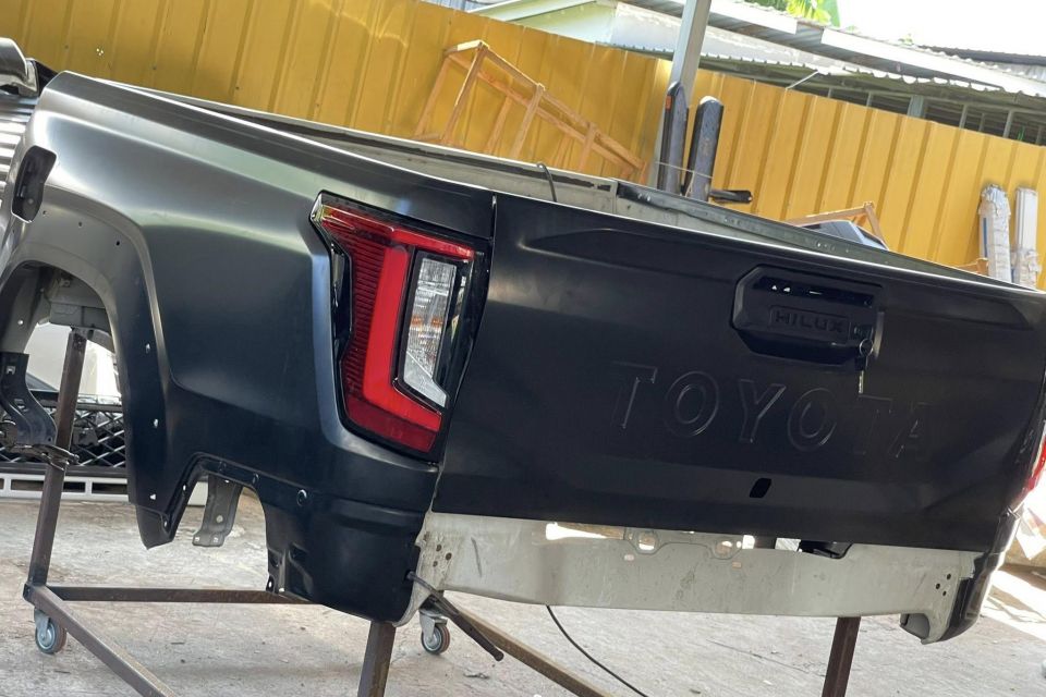 We can see a HiLux Revo wearing the front- and rear-end styling of the new-generation model, as well as various shots of the individual parts fabricated to enable this transformation.