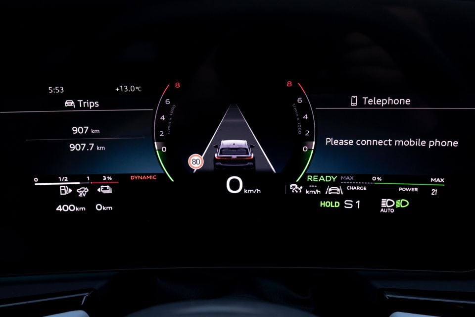 As you’d expect, the A5 e-hybrid will default to battery power if driving and road conditions permit. In town, it silently starts up and gets rolling, with only the faint whirring of the electric motor permeating the cabin, save for the UFO-like external pedestrian sound which plays at low speeds.
