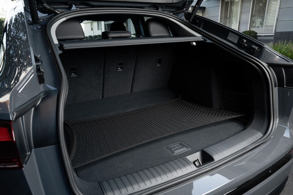 Further back, the Q6 Sportback e-tron isn’t far off the cargo volume of its SUV sibling, quoting 511-1373 litres of capacity (versus 526-1529L for the SUV). The tapered roofline will eat into space for taller cargo, but it’s a deep boot with thoughtful touches like netting and hooks to help secure your odds and ends.