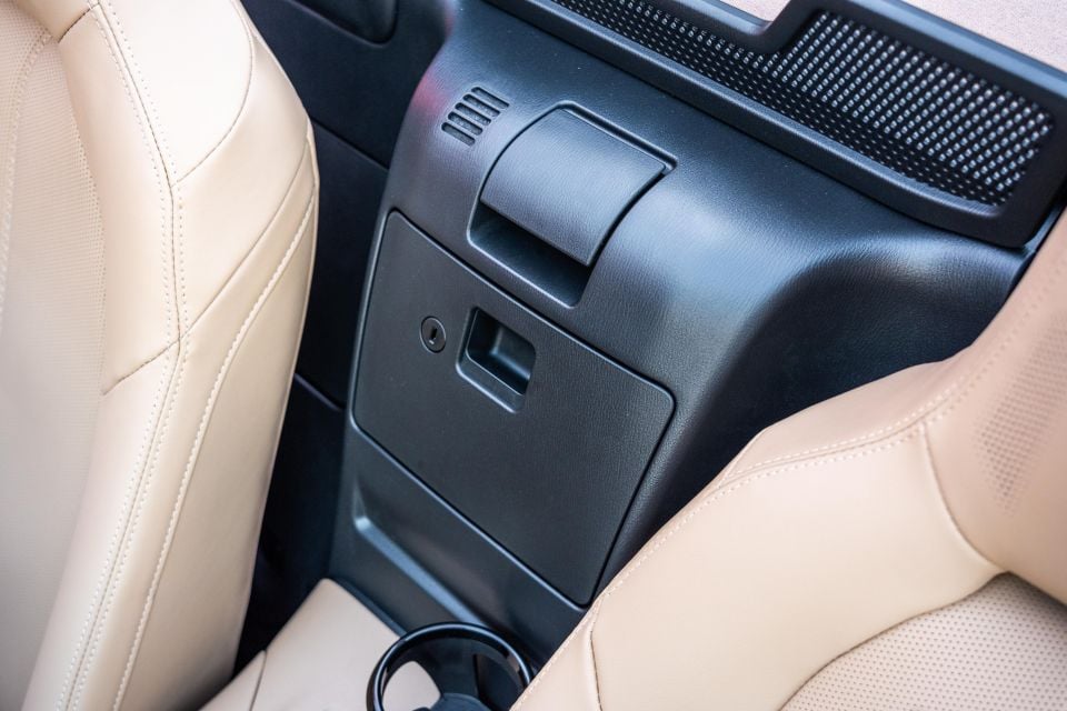 Larger items such as service books fit snuggly in a lockable storage compartment between the seat backs, which is probably the most usable compartment available.
