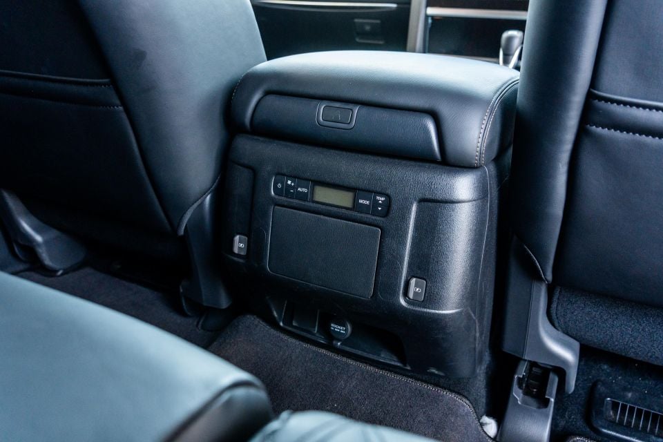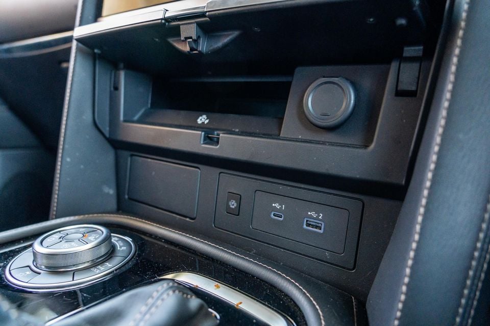 A long list of amenities complements the size of the space. Features include twin USB-A outlets, dedicated climate controls, door- and seatback storage, and a folding centre armrest with pop-out cupholders. Additionally, the front centre console bin has a bi-directional lid that can also be opened by rear passengers, affording them access to the deep cubby within.