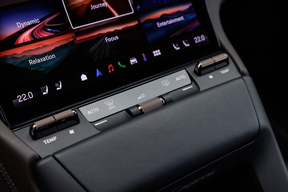 Crucially, though, Porsche remembers the end-user’s operating needs, retaining physical controls for the Cayenne’s climate system, while also providing a hand rest pad beneath the Flow Display so that you can still successfully tap at its display even if you’re driving on a bumpier road.
