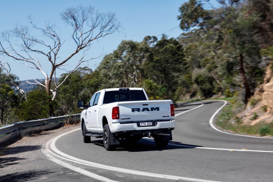 Ram says unladen 0-100km/h performance improves to about 7.2 seconds, and the transmission defaults to second‑gear starts to trim fuel use, switching to first when it detects heavy loads. An exhaust brake is standard for long descents while towing.