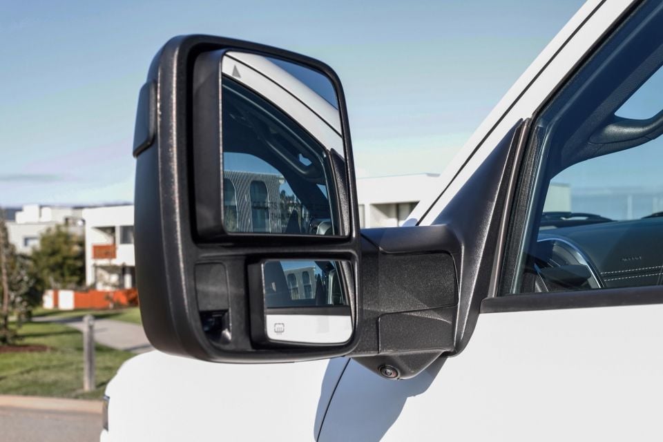 Six airbags are standard. The mirrors power‑fold, telescope and extend for towing, and a side‑view camera monitor activates with the indicators to assist during lane changes and turns.