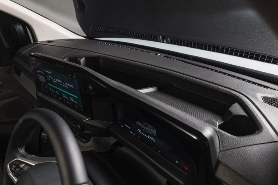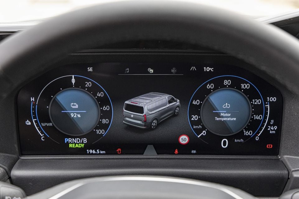 Squeezing the throttle has the eTransporter propelling itself to the speed limit quickly, while remaining planted and composed. Almost 100Nm of extra torque compared to the E-Transit Custom is no small thing, and the battery – mounted under the cargo area – keeps the van’s centre of gravity nice and low.
