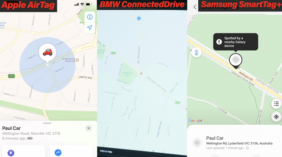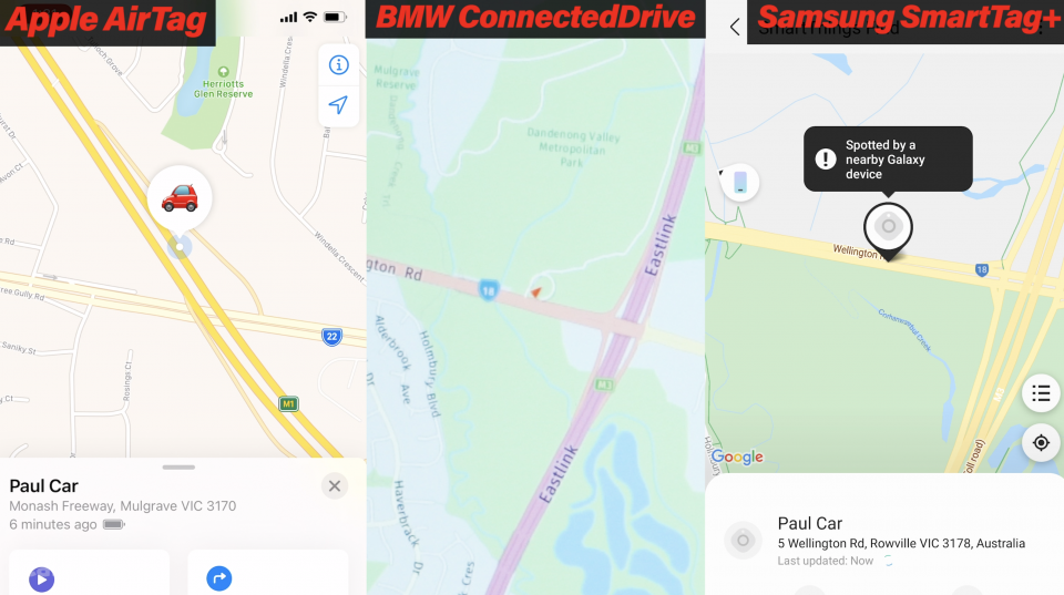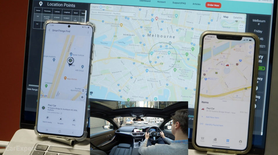 Again, the AirTag was out of date and showed the car still on the previous freeway several kilometres back, whereas the rest of the devices accurately relayed the vehicle’s location.